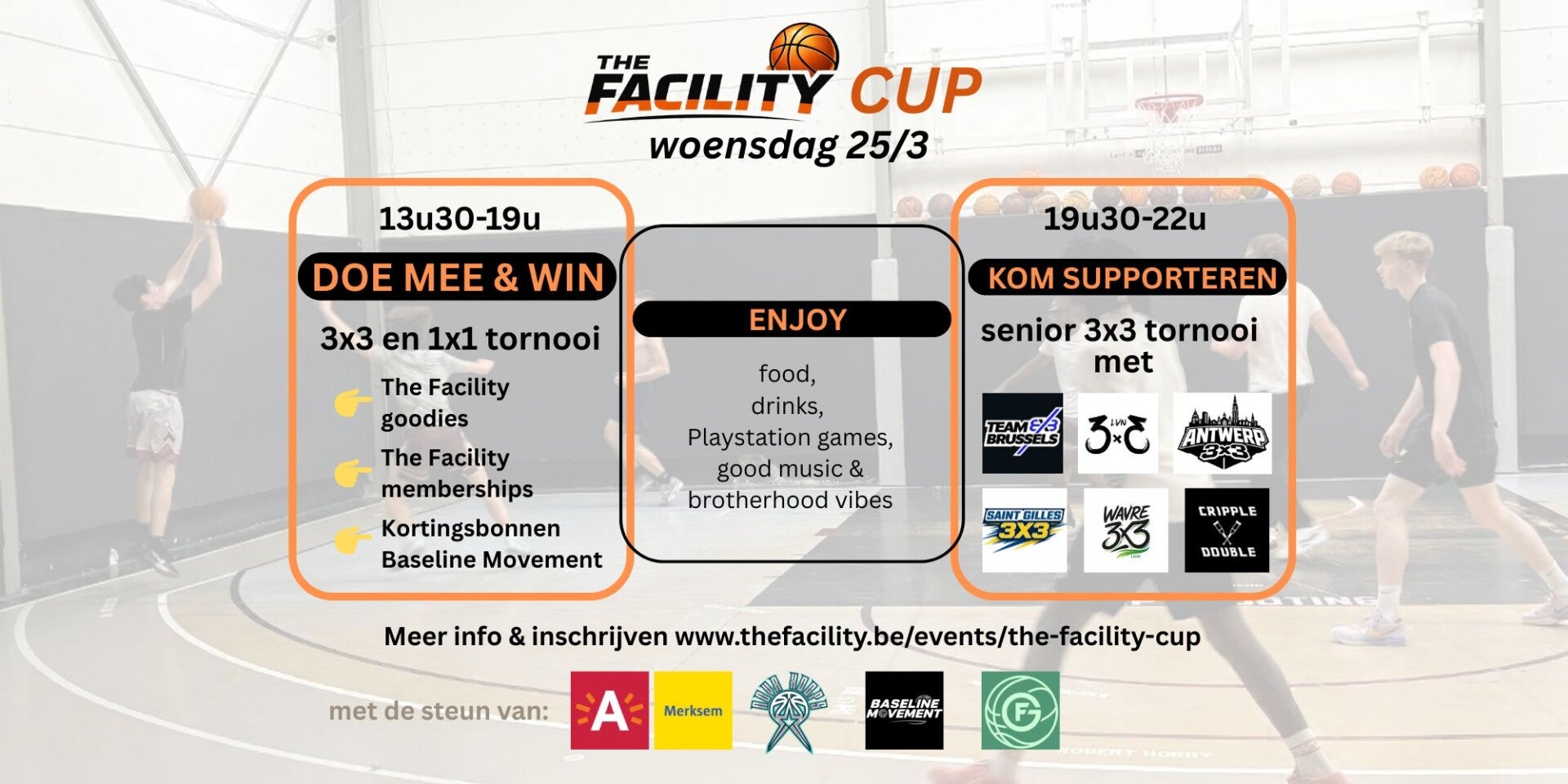 In de namiddag is er een jeugdtornooi 3x3 voor -U18 en eentje voor +U18 en een 1x1 tornooi. 's Avonds is er een 3x3 tornooi met enkele toppers uit Antwerpen, Brussel, Sint-Gillis, Leuven, Kortenberg en Waver. De moeite om te komen supporteren!